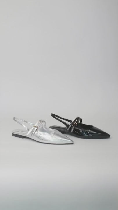 Sandalia flat para mujer de punta afilada en charol, cómoda, ligera y elegante, con plantilla viscoelástica, suela de caucho termoplástico y cierre ajustable.